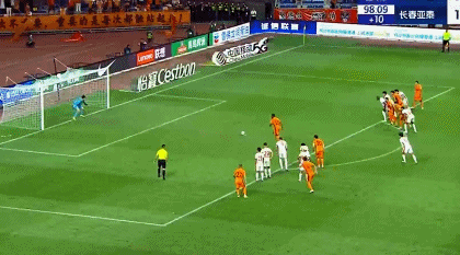 比赛的第31分钟,张华晨主罚禁区前任意球右脚劲射,球击中横梁下沿之后反弹入网,1比0!