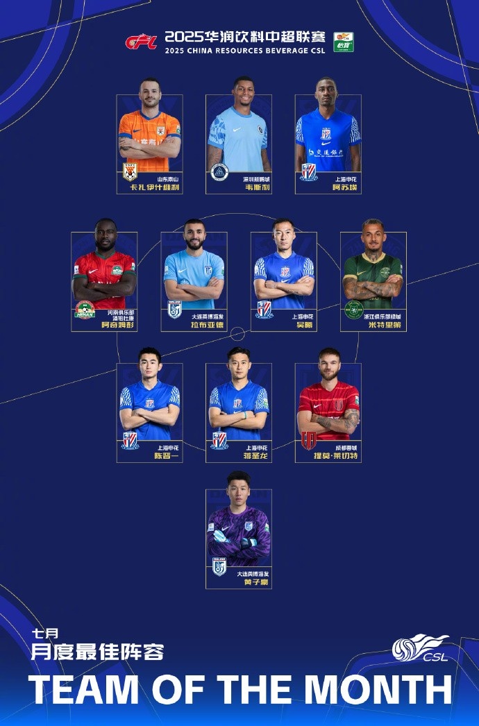 中超7月最佳阵容名单如下: