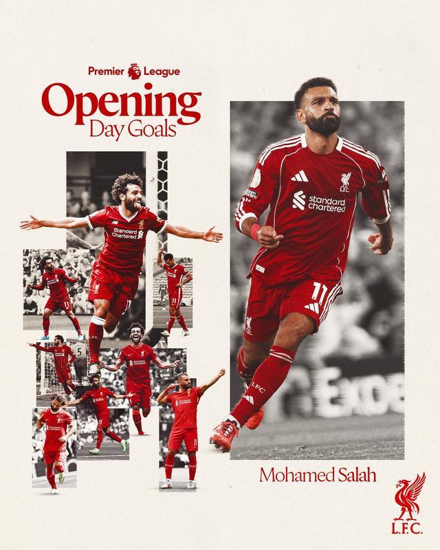 利物浦官方社交媒体晒出了萨拉赫的海报,祝贺他打进10个英超揭幕战进球,并配文:“萨拉赫是英超历史上第一位打进10个揭幕战进球的球员!”